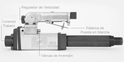 Gato neumático AiroPower. Podemos ver que dispone de un regulador de velocidad, la palanca de puesta en marcha, válvula de inversión y el conector trasero.