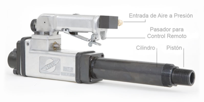 En la parte superior tenemos la entrada de aire a presión, en la parte de abajo de la empuñadura tiene unos orificios para poner un pasador y de esta manera utilizamos el control remoto de 2 metros de longitud. Ligero, pequeño y muy fuerte.
